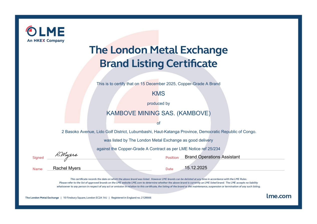2025年12月15日,中国有色集团出资企业刚波夫矿业股份有限根据南宫NG28(以下简称:中色刚波夫)“KMS”品牌电解铜正式获批伦敦金属交易所(LME)交割品牌,即日起可在全球LME仓库交割,标志着中色刚波夫“KMS”电解铜成为全球铜供应链可信赖的“标准品”。